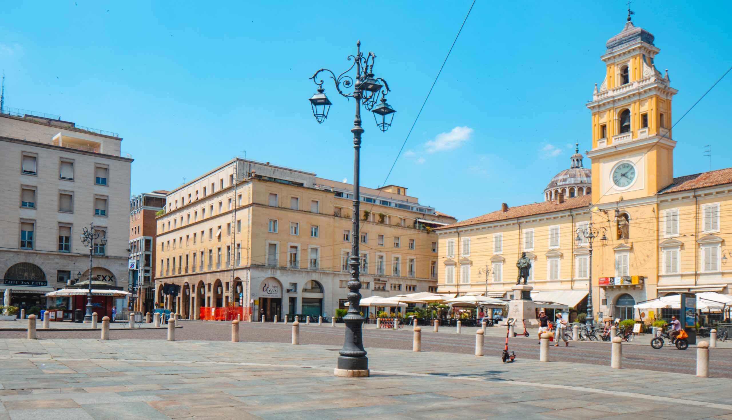 Una statua dorata con una croce in mano guarda Parma da sessantatré metri d’altezza. L’Angelo d’Oro corona il campanile del Duomo, una torre di mattoni rosso scuro che si stacca dalla cattedrale di Santa Maria Assunta e domina piazza Duomo dal 1294. La superficie è tutta mattone a vista, interrotto solo da spigoli di marmo bianco che salgono verticalmente dalla base alla sommità. Quattro fasce orizzontali dividono il fusto, separate da cornici con archetti a sesto acuto in pietra chiara che creano un ritmo regolare lungo tutta l’altezza. Il vescovo Obizzo Sanvitale la fece costruire in dieci anni, tra il 1284 e il 1294, per sostituire un campanile più antico ormai inadeguato. La copertura piramidale a otto lati arrivò dopo, nel Trecento, completata dalla statua in rame dorato alta un metro e quaranta. Quella che si vede oggi è una copia: l’originale quattrocentesco sta al riparo nel Museo Diocesano, protetto dopo secoli esposto agli agenti atmosferici che ne avevano compromesso la conservazione.