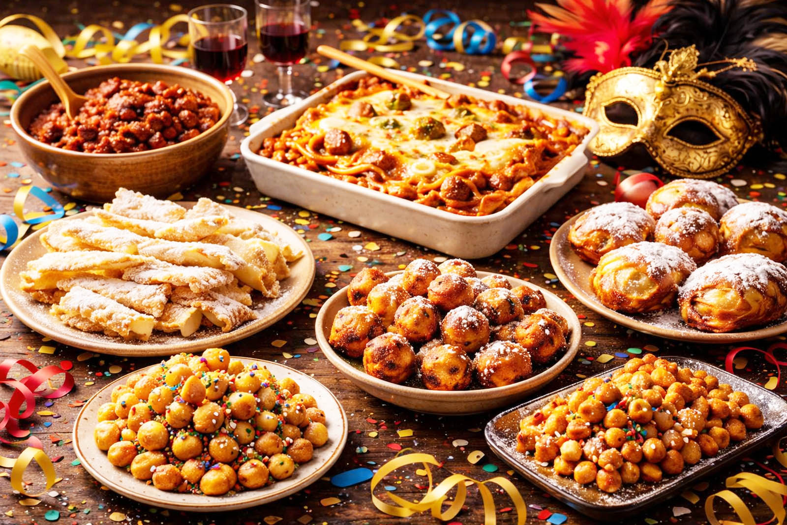 Tavolata di Carnevale con lasagne, ragù, chiacchiere, castagnole e struffoli su tavolo festivo